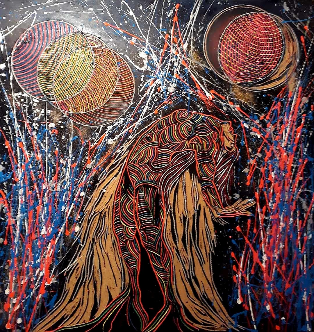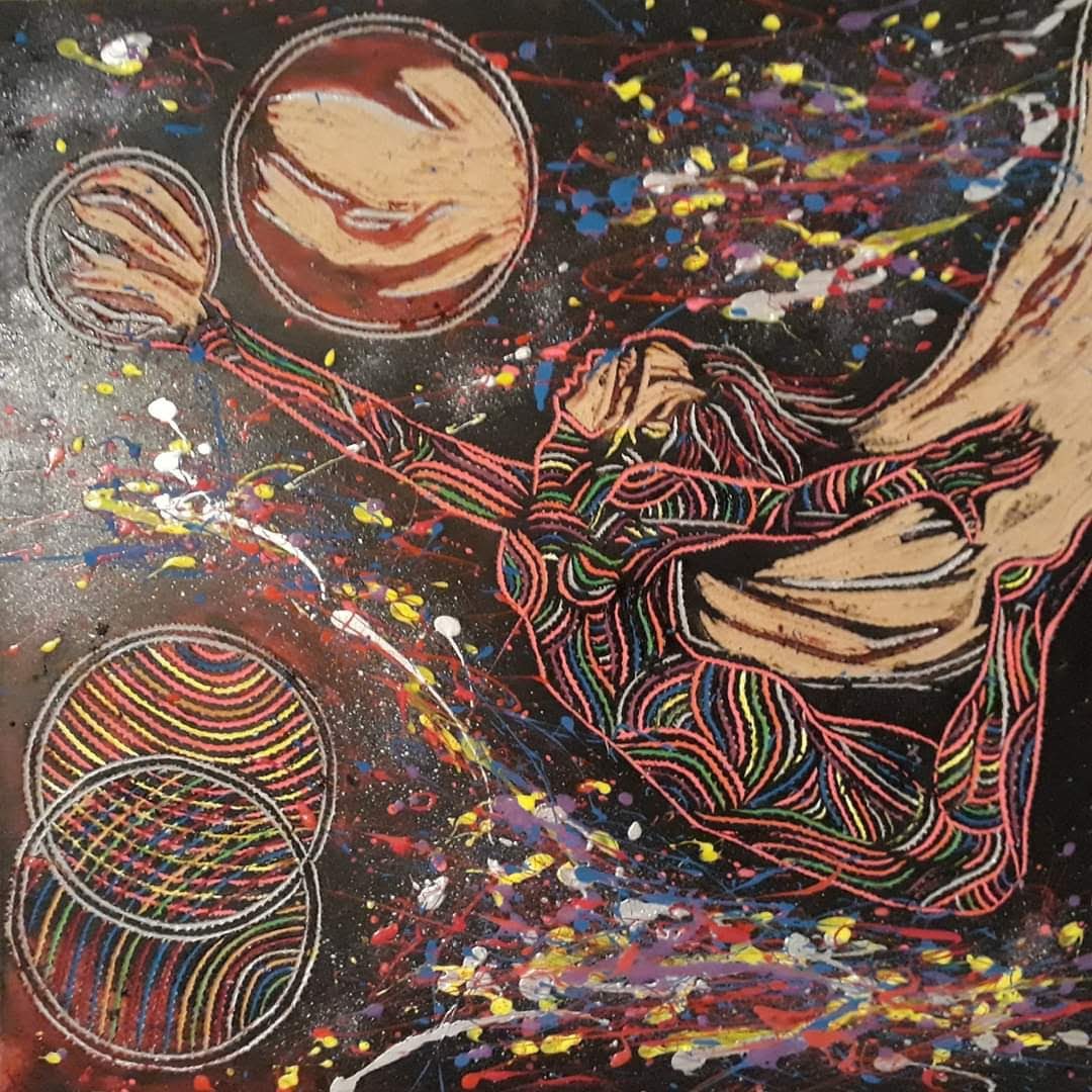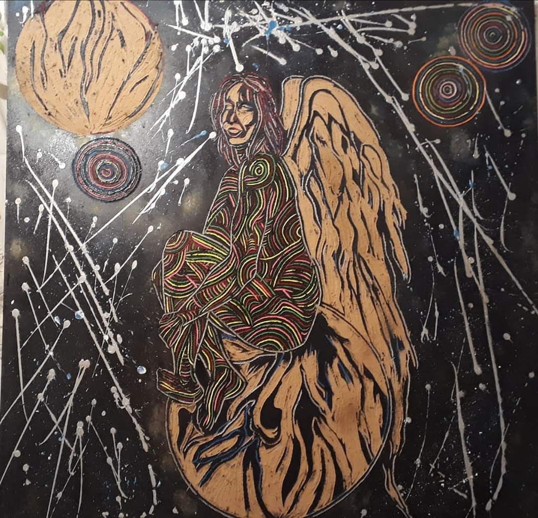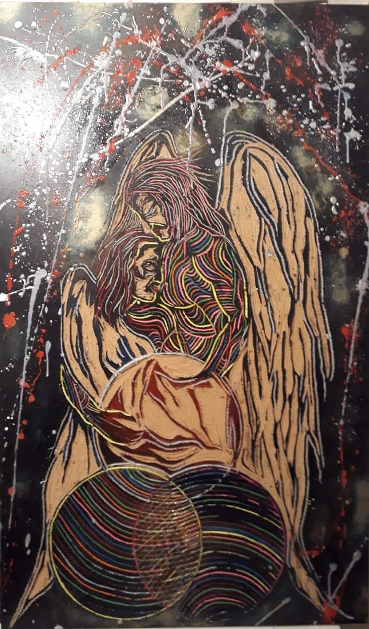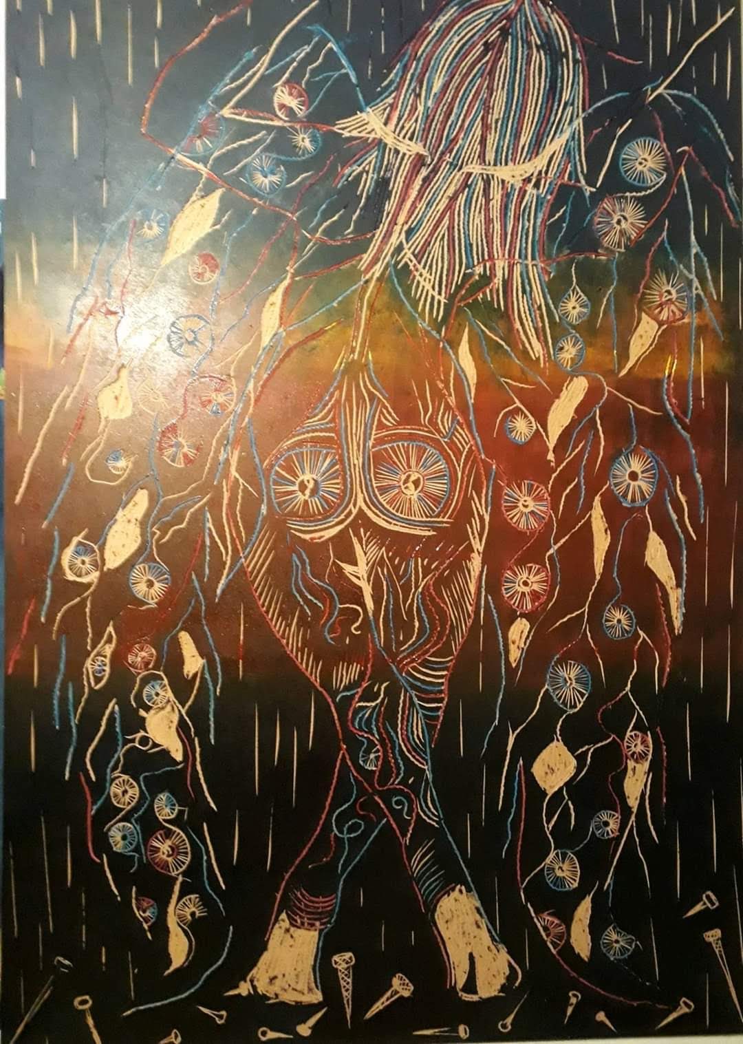 Mi obra aborda como temática la espiritualidad, el trascender a lo sublime, el despojo de lo mundano. La unión del humano con el universo. Renacer a través del arte. Utilizo la matriz de la xilografía como obra en sí por la riqueza de su textura, no realizo impresiones ni bocetos previos. La composición por lo general son figuras humanas en escorzo con colores complementarios y estridentes en acrílico. Predomina el surrealismo, dripping y fondos abstractos. El espectador puede percibir la obra a través del tacto y la visión.