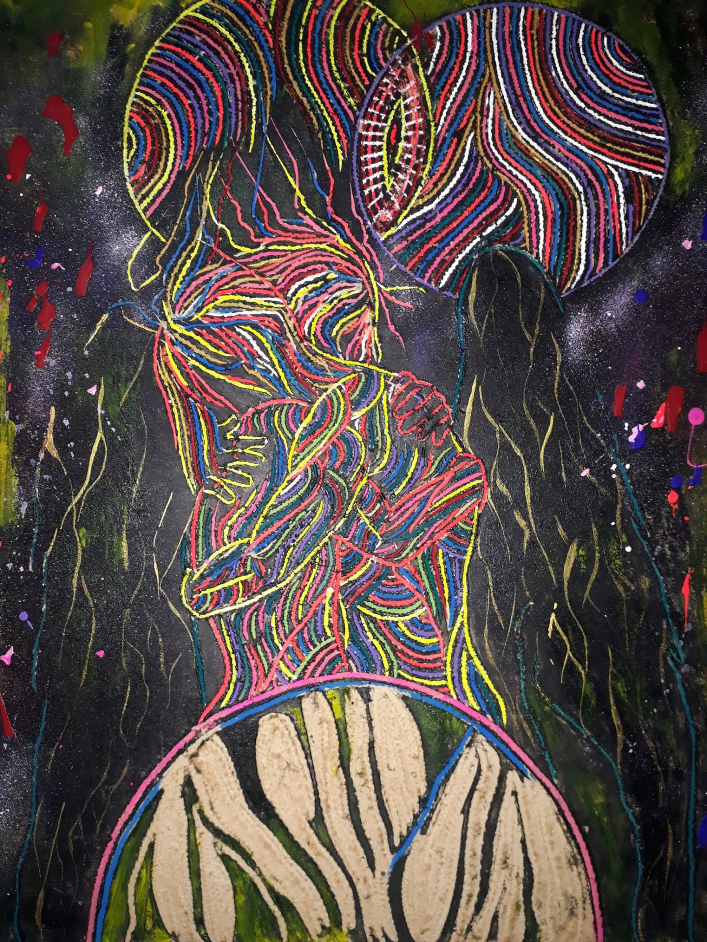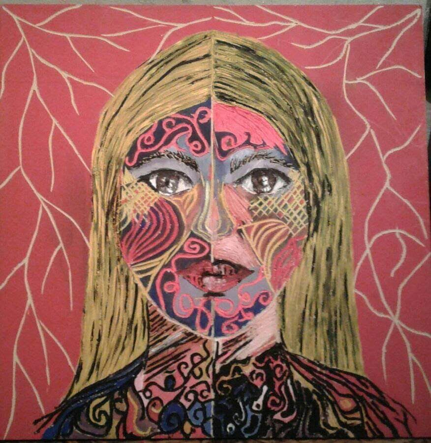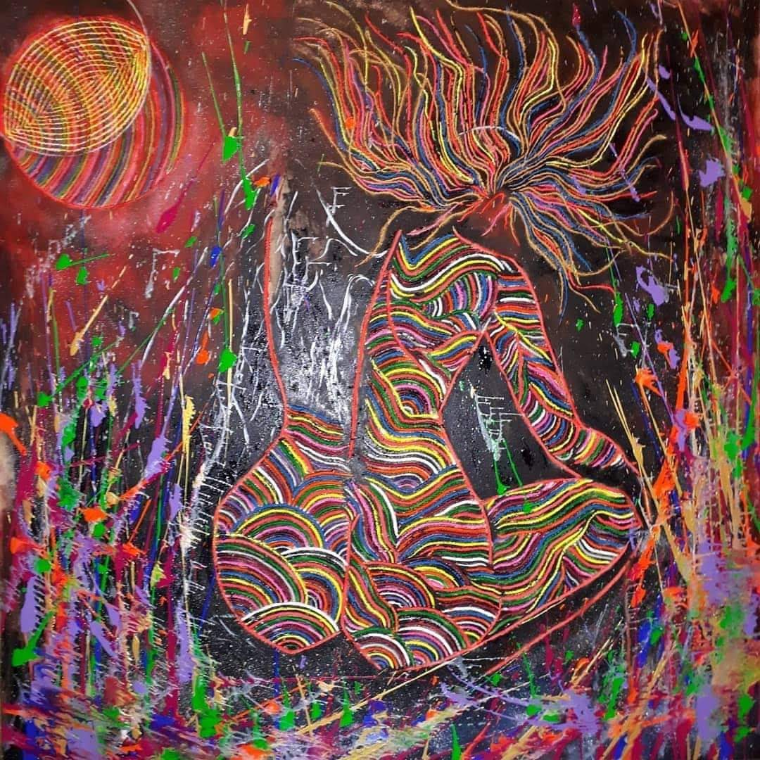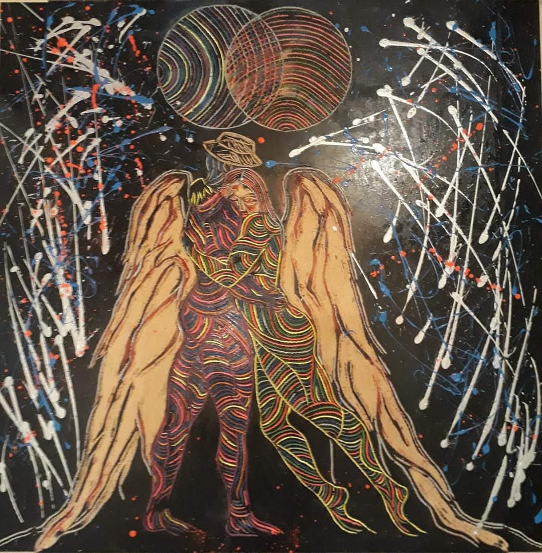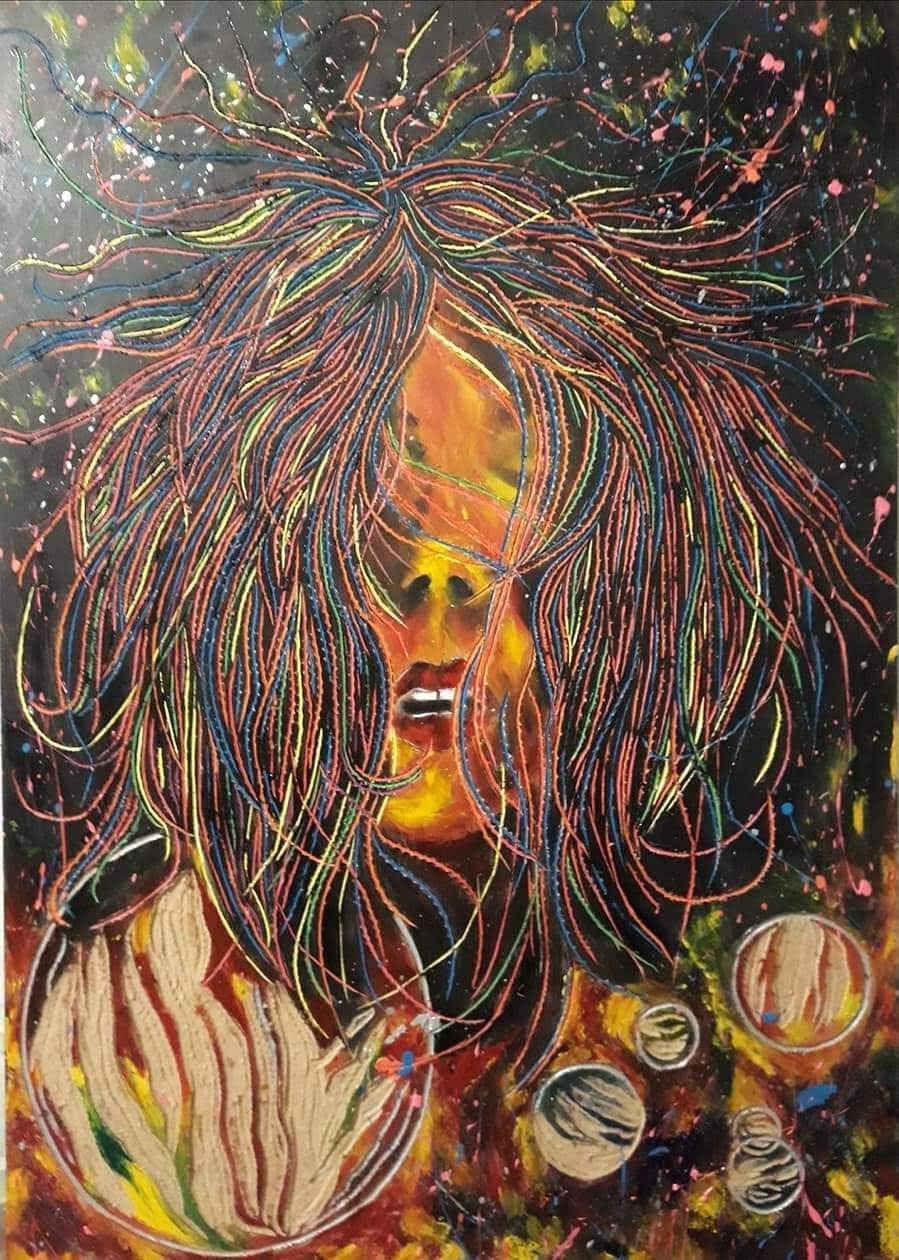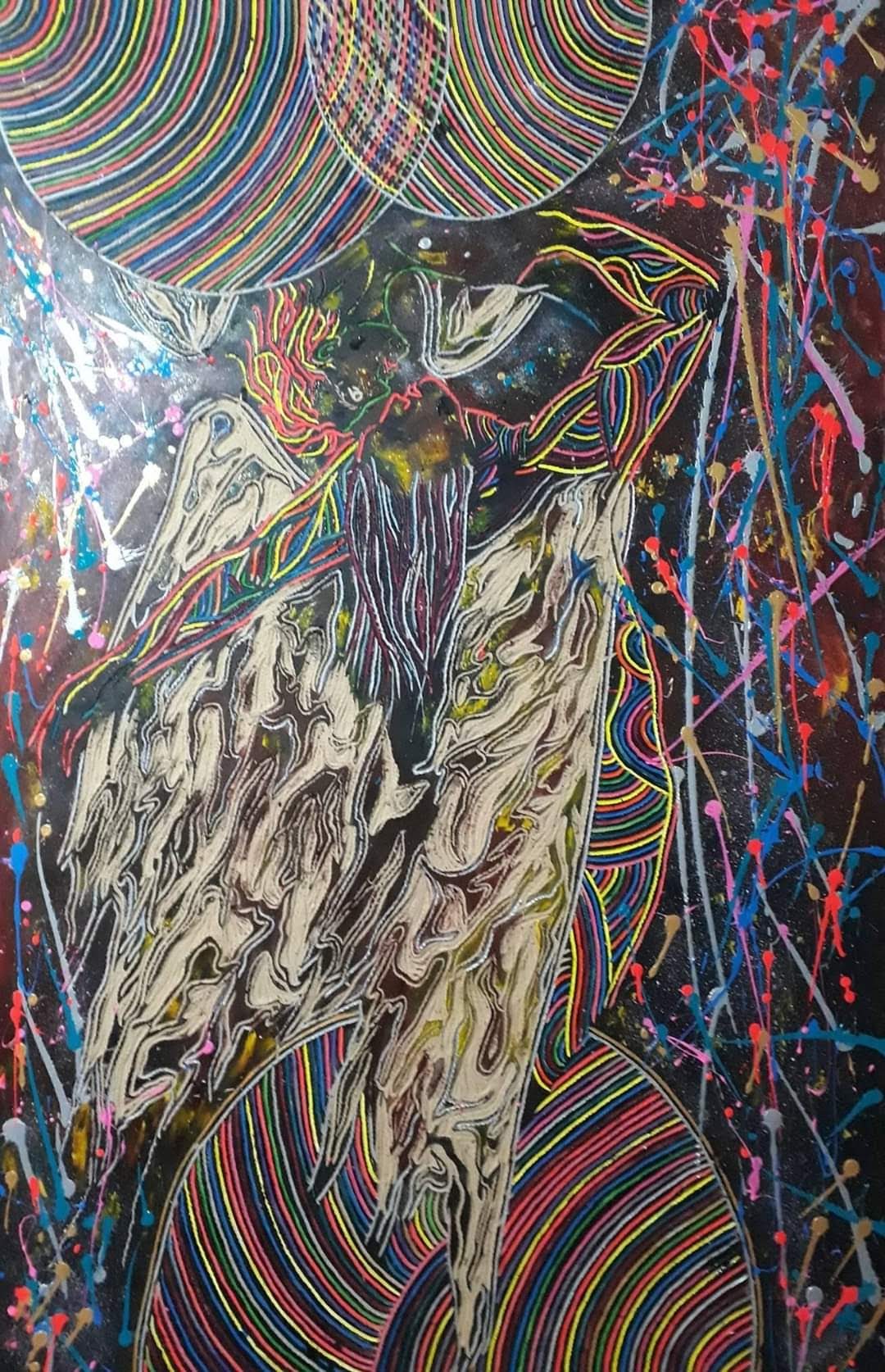 Mi obra aborda como temática la espiritualidad, el trascender a lo sublime, el despojo de lo mundano. La unión del humano con el universo. Renacer a través del arte. Utilizo la matriz de la xilografía como obra en sí por la riqueza de su textura, no realizo impresiones ni bocetos previos. La composición por lo general son figuras humanas en escorzo con colores complementarios y estridentes en acrílico. Predomina el surrealismo, dripping y fondos abstractos. El espectador puede percibir la obra a través del tacto y la visión.