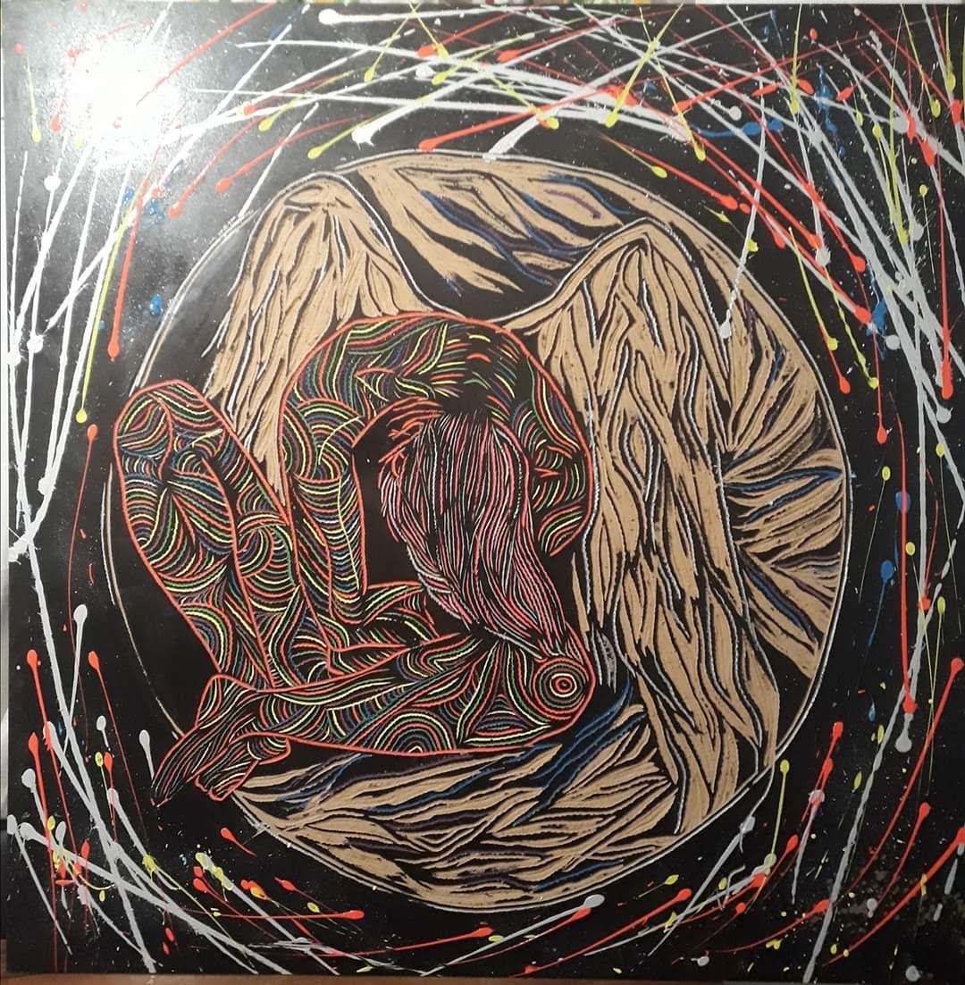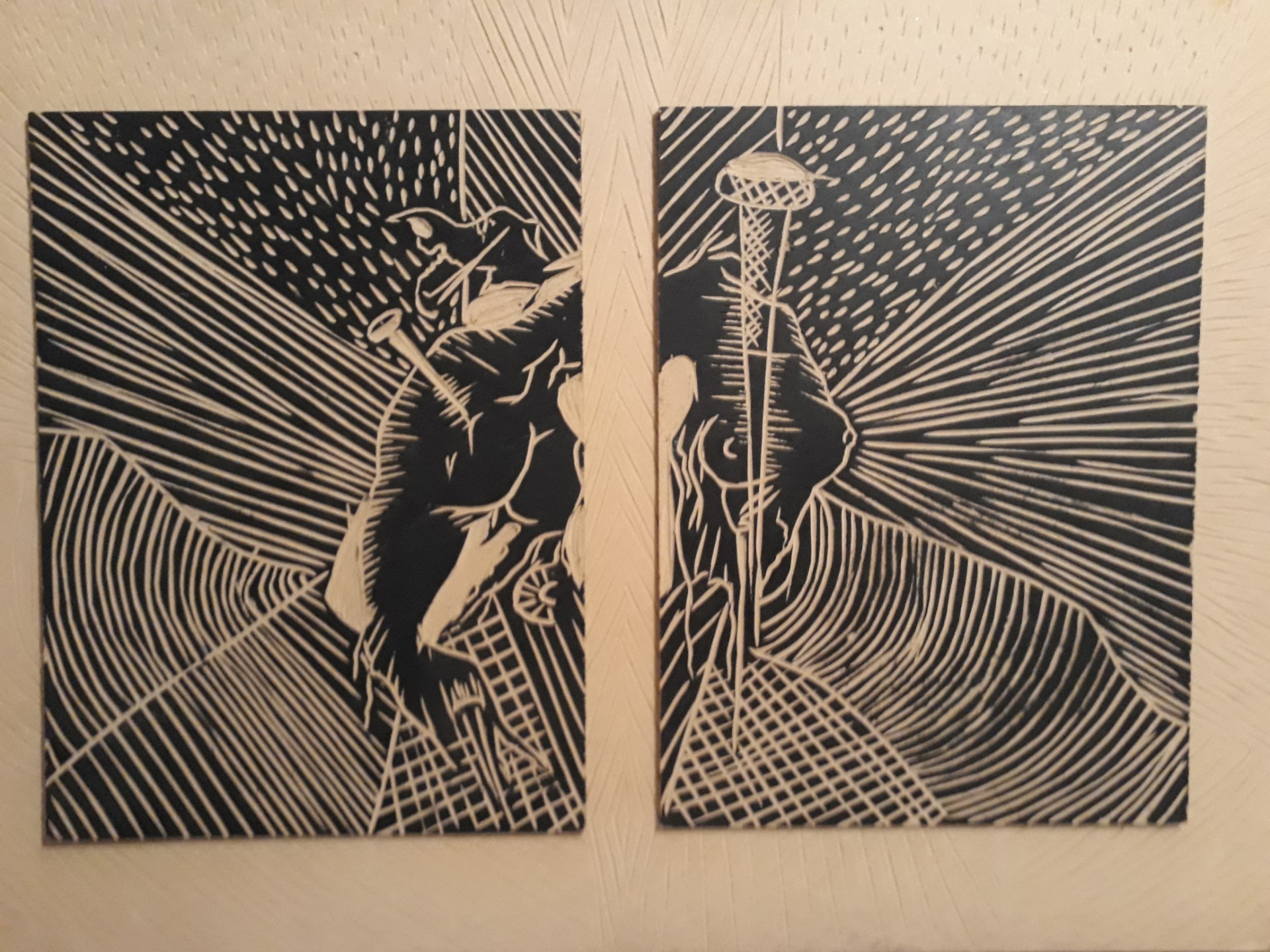 Lo terrenal, lo celestial, lo trascendental, son xilografías donde exploro al máximo la matriz como obra en sí. Una serie de xilografías y esgrafiados donde se representa el dolor, el sufrimiento, la crucifixión, la oscuridad, la soledad, lo místico, la pasión...que se pueden percibir a través del color, la textura y la figuracion en un mundo surrealista.