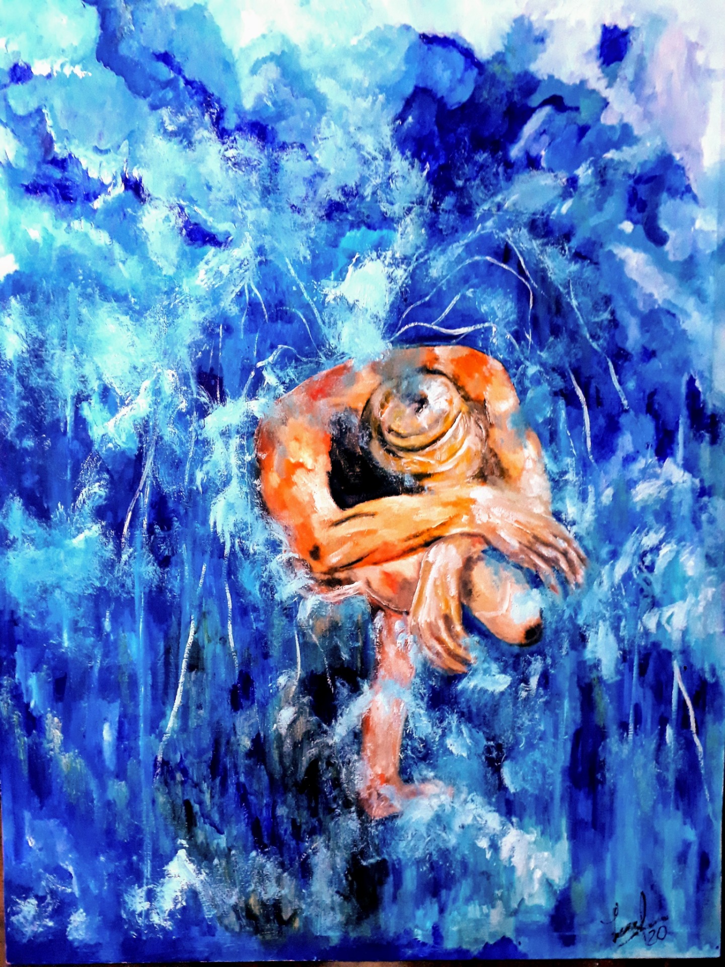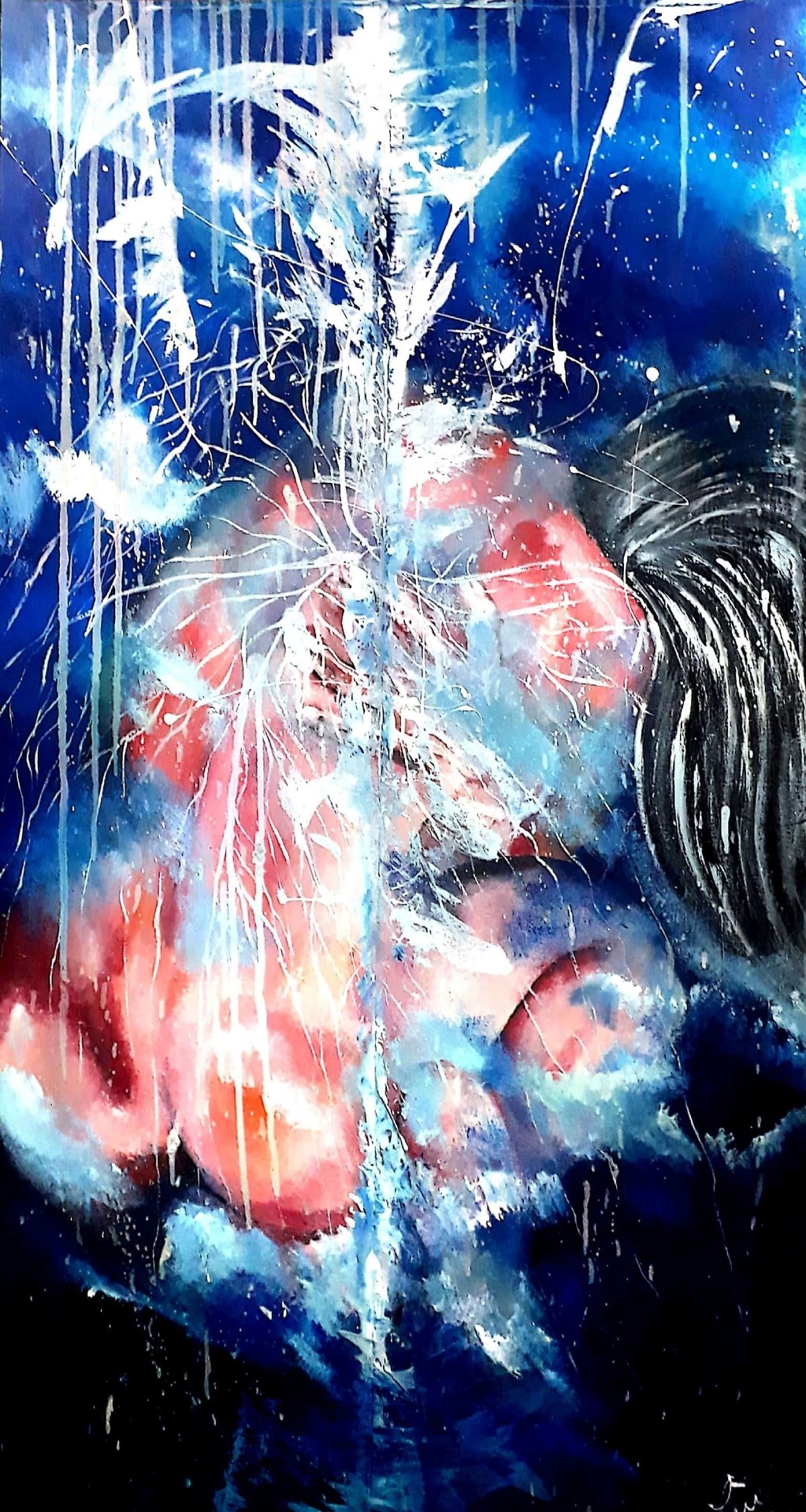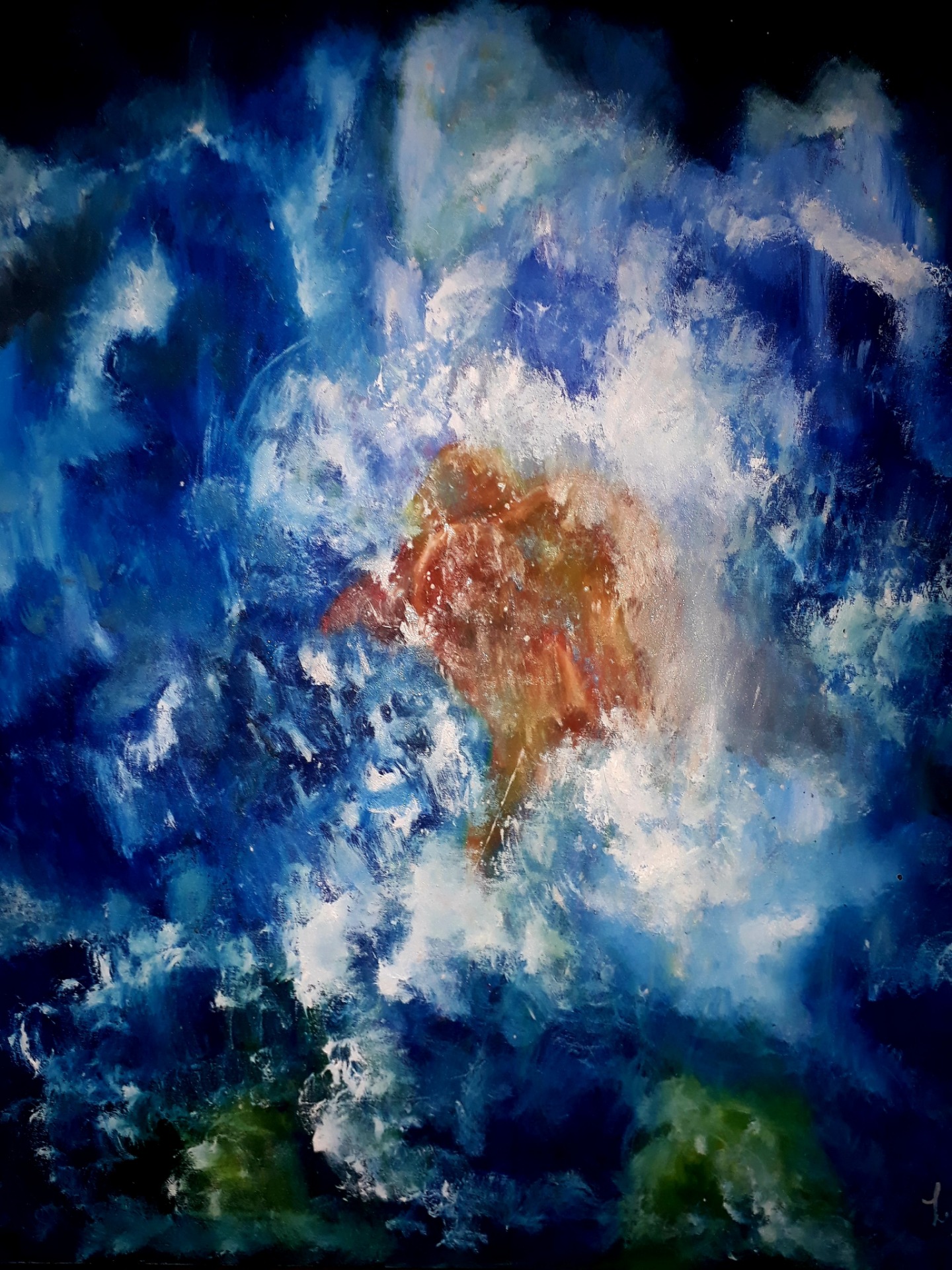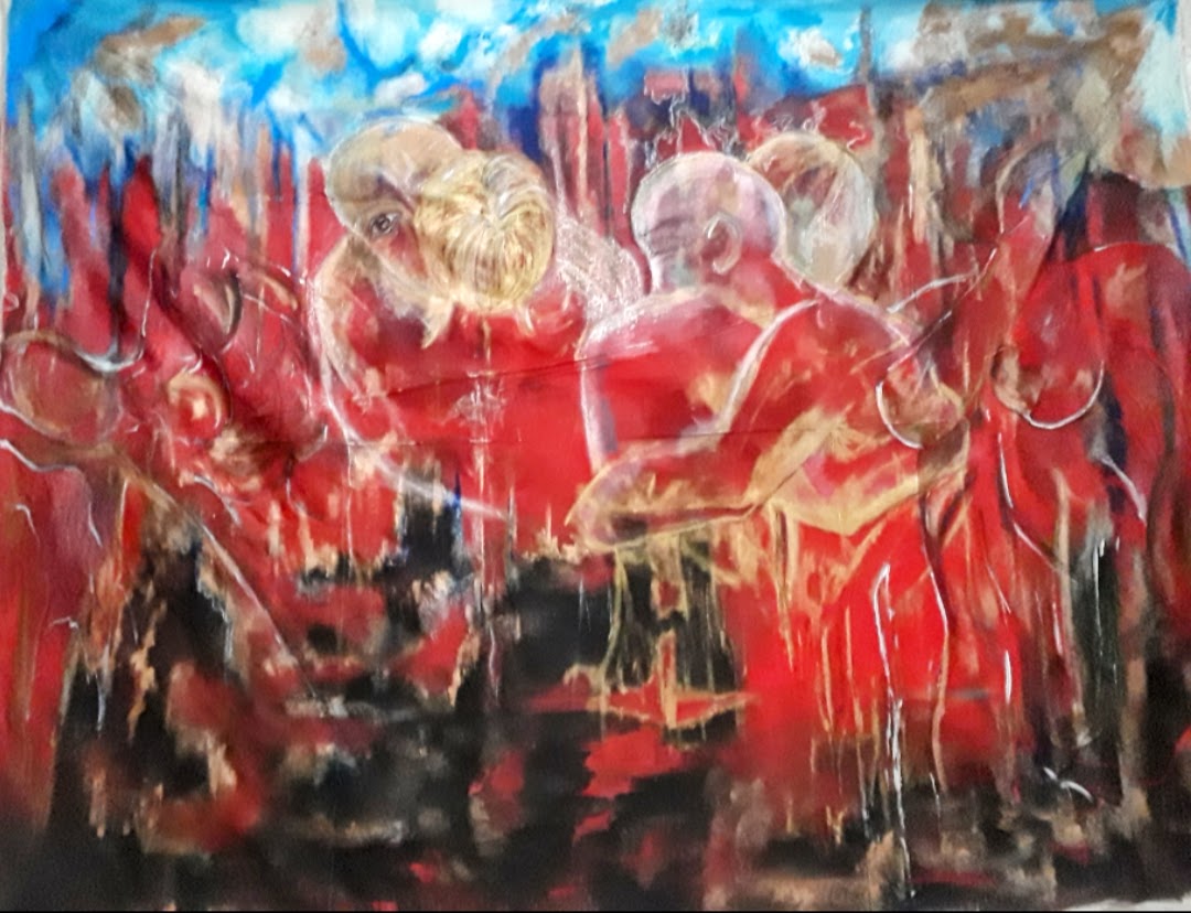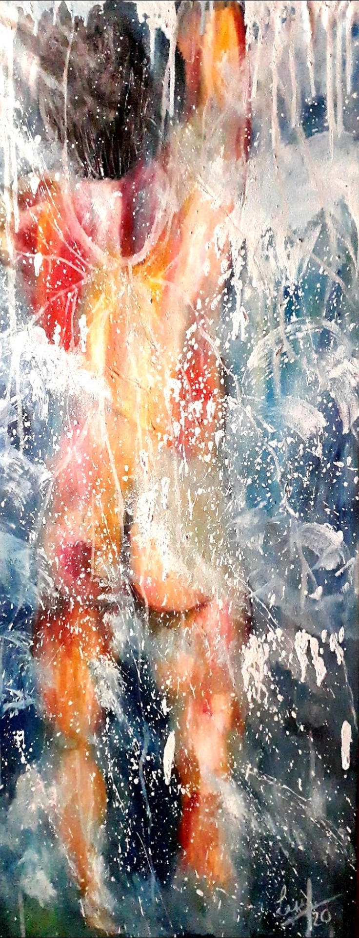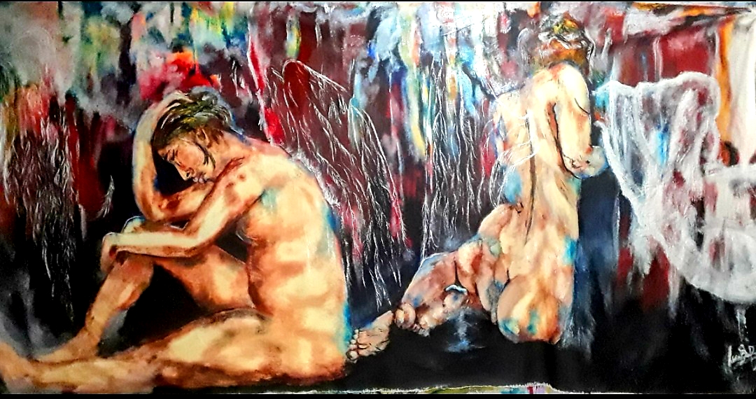 Figura y fondo se fusionan, abstracción y figuración, donde predominan los cuerpos en escorzos, el cielo y el agua, logrando así expresar la pasión que siento al pintar, en esta oportunidad con óleo sobre lienzo. Predomina el género expresionista, surrealista, la abstracción y el dripping.