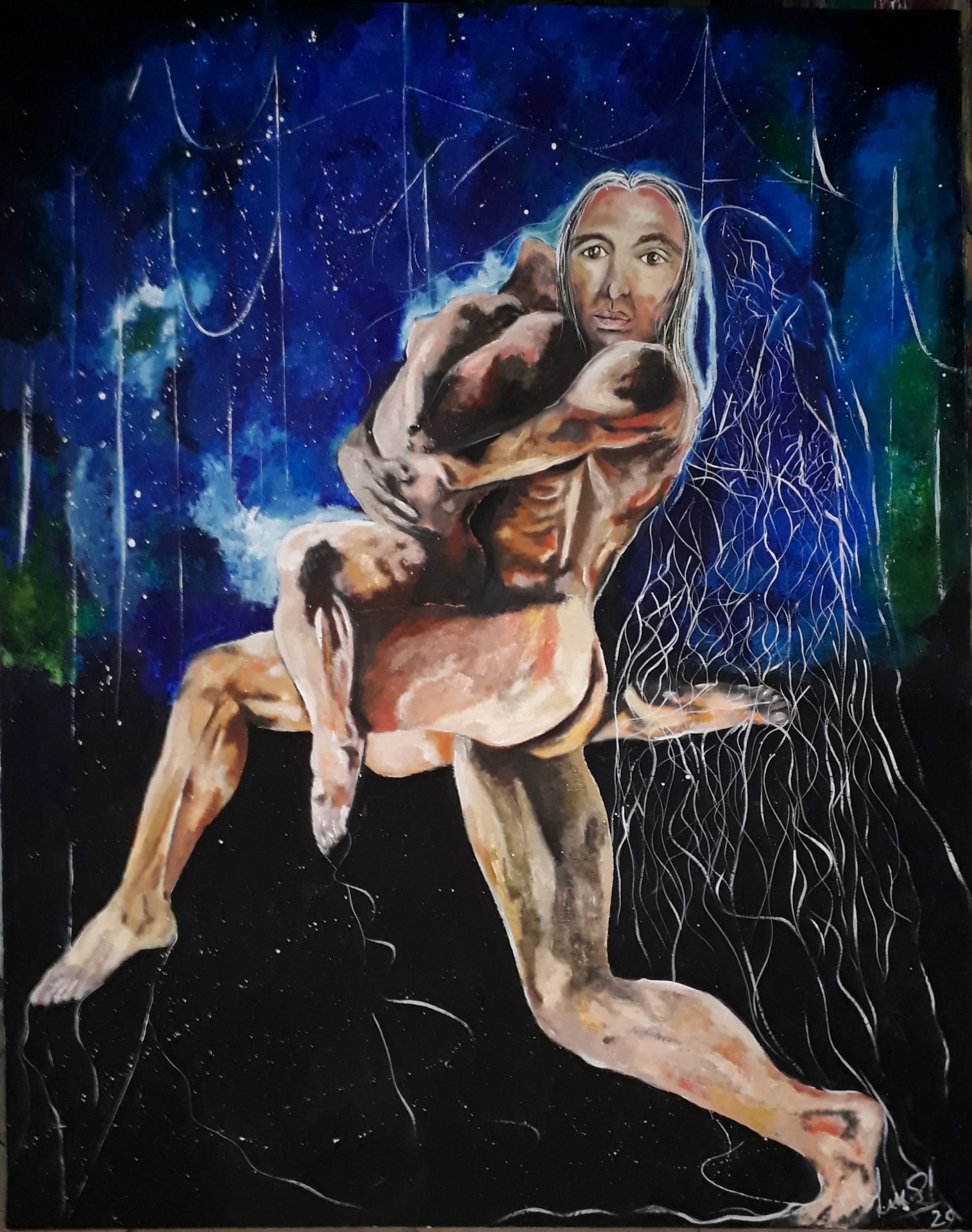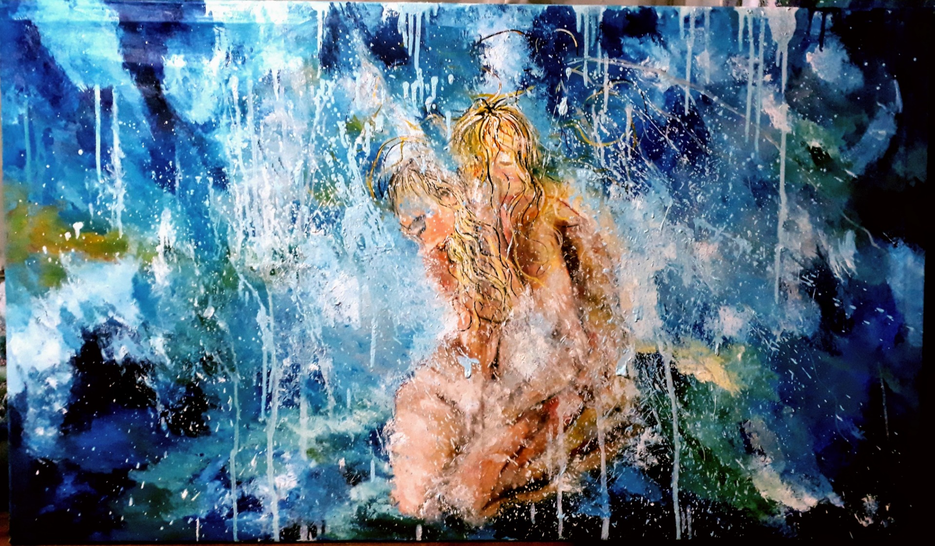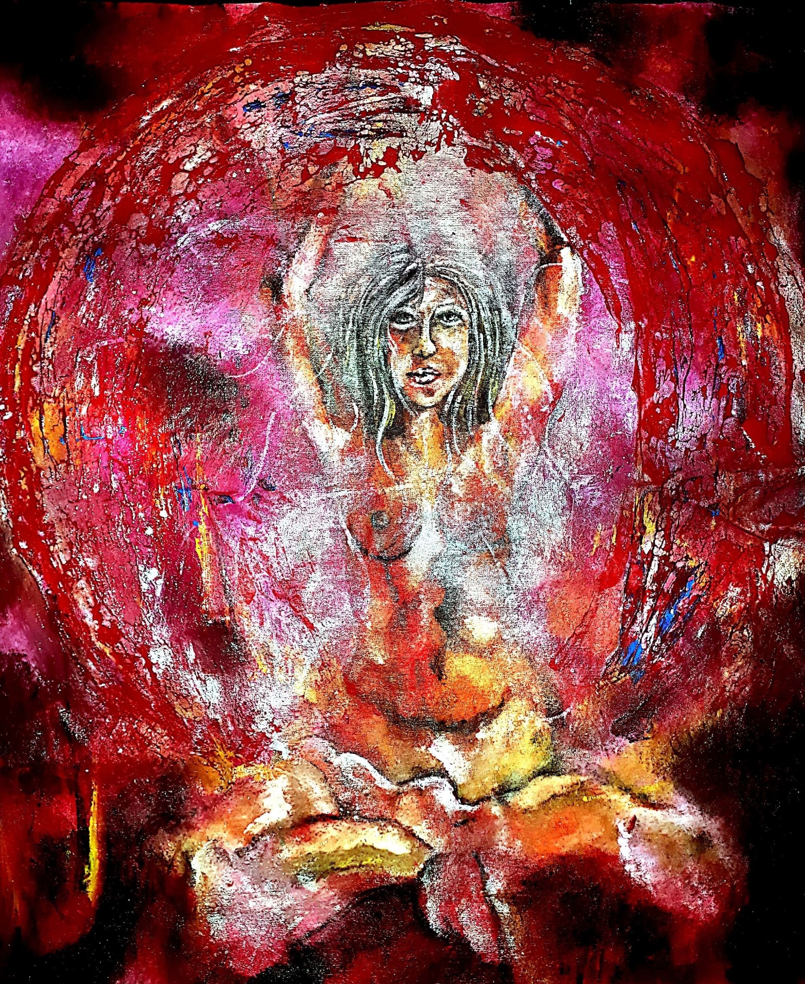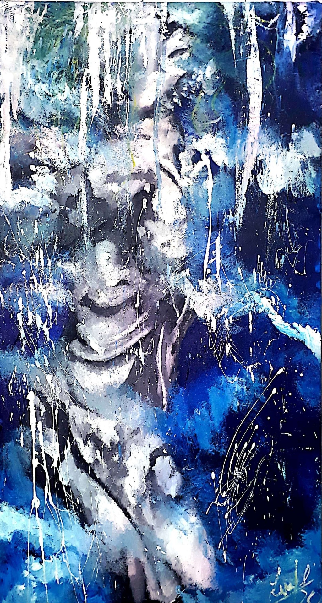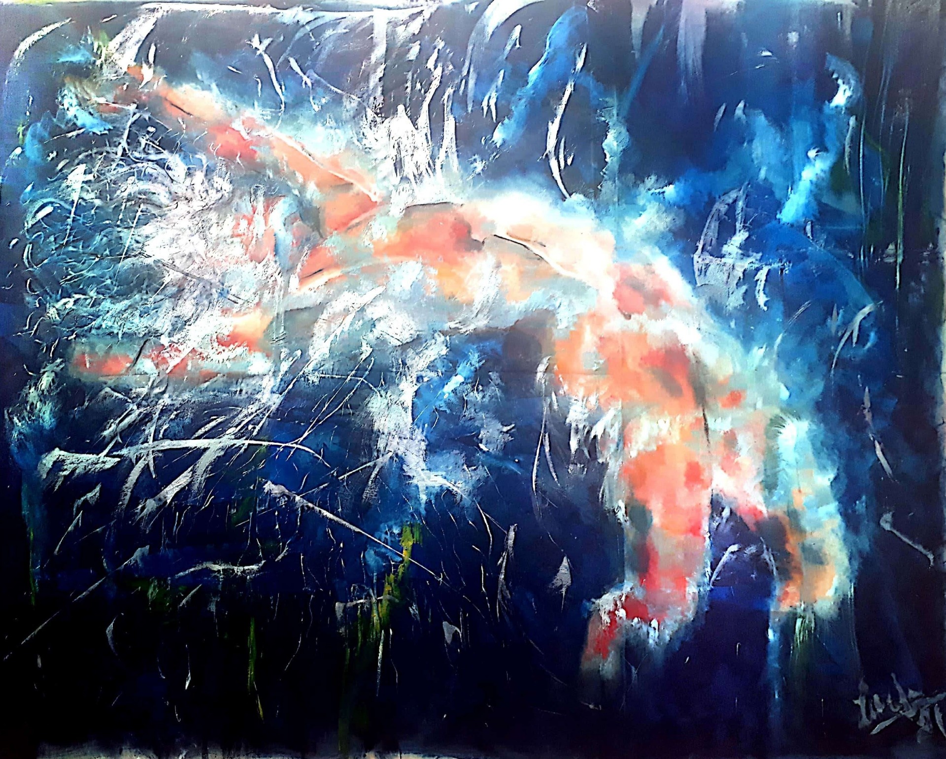 Figura y fondo se fusionan, abstracción y figuración, donde predominan los cuerpos en escorzos, el cielo y el agua, logrando así expresar la pasión que siento al pintar, en esta oportunidad con óleo sobre lienzo. Predomina el género expresionista, surrealista, la abstracción y el dripping.