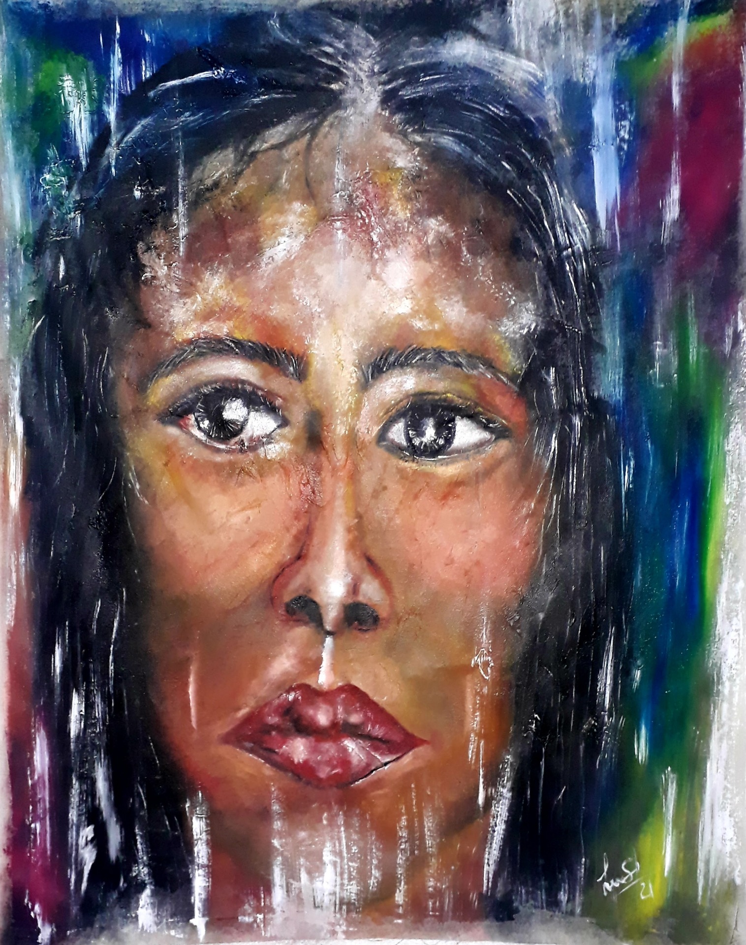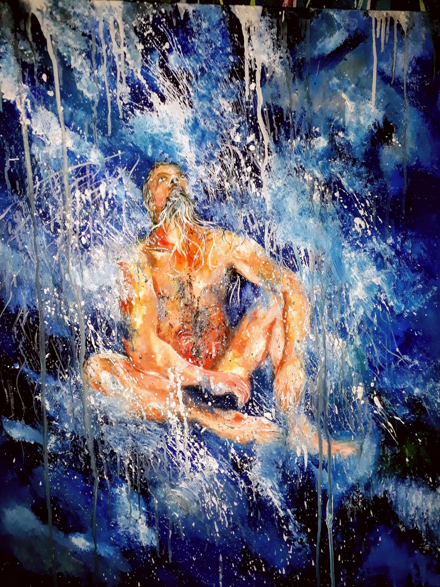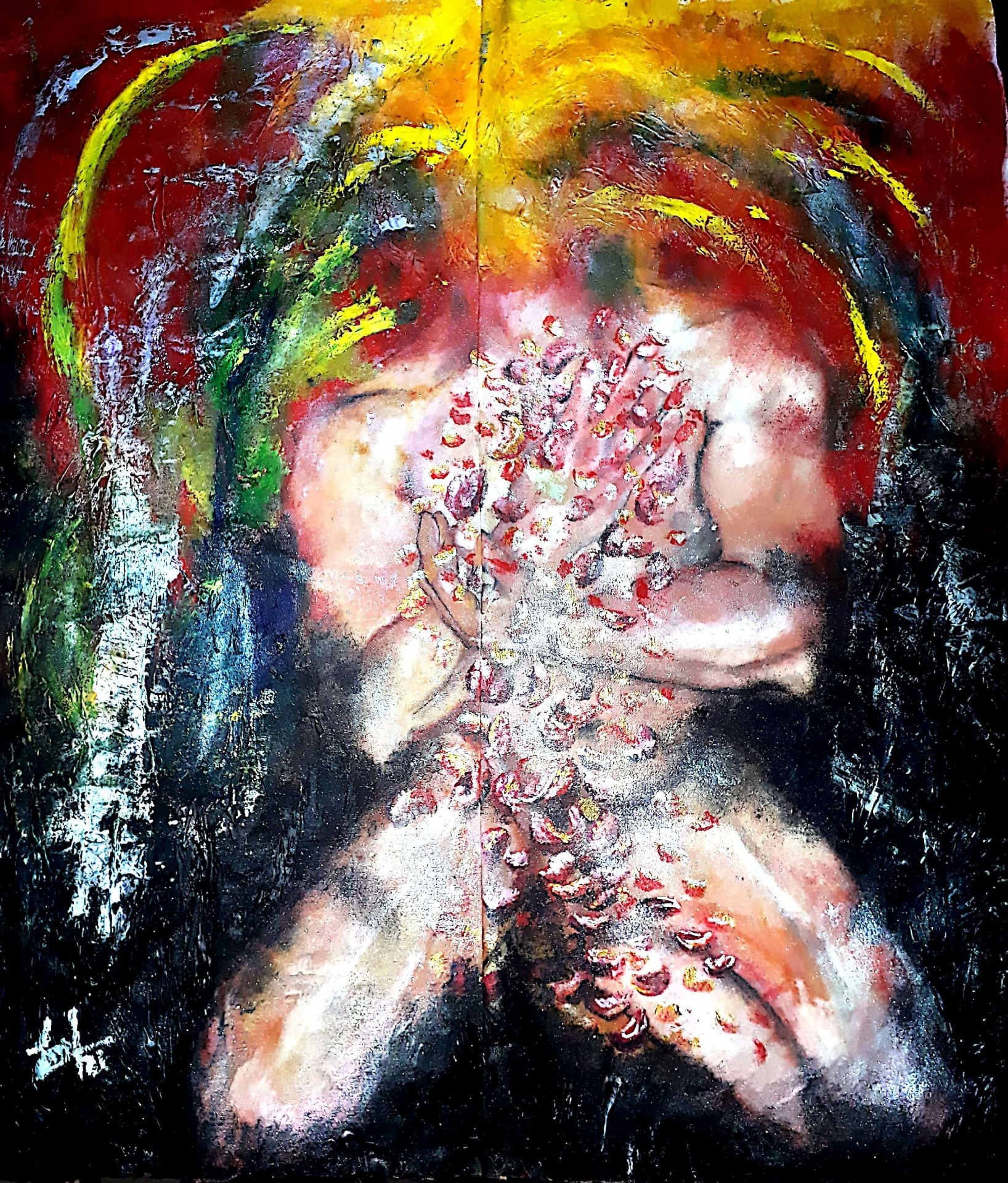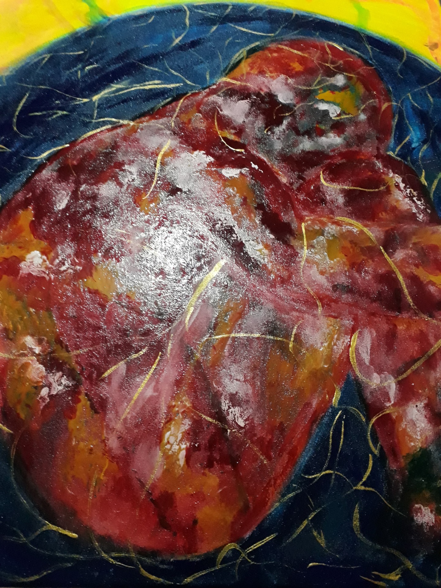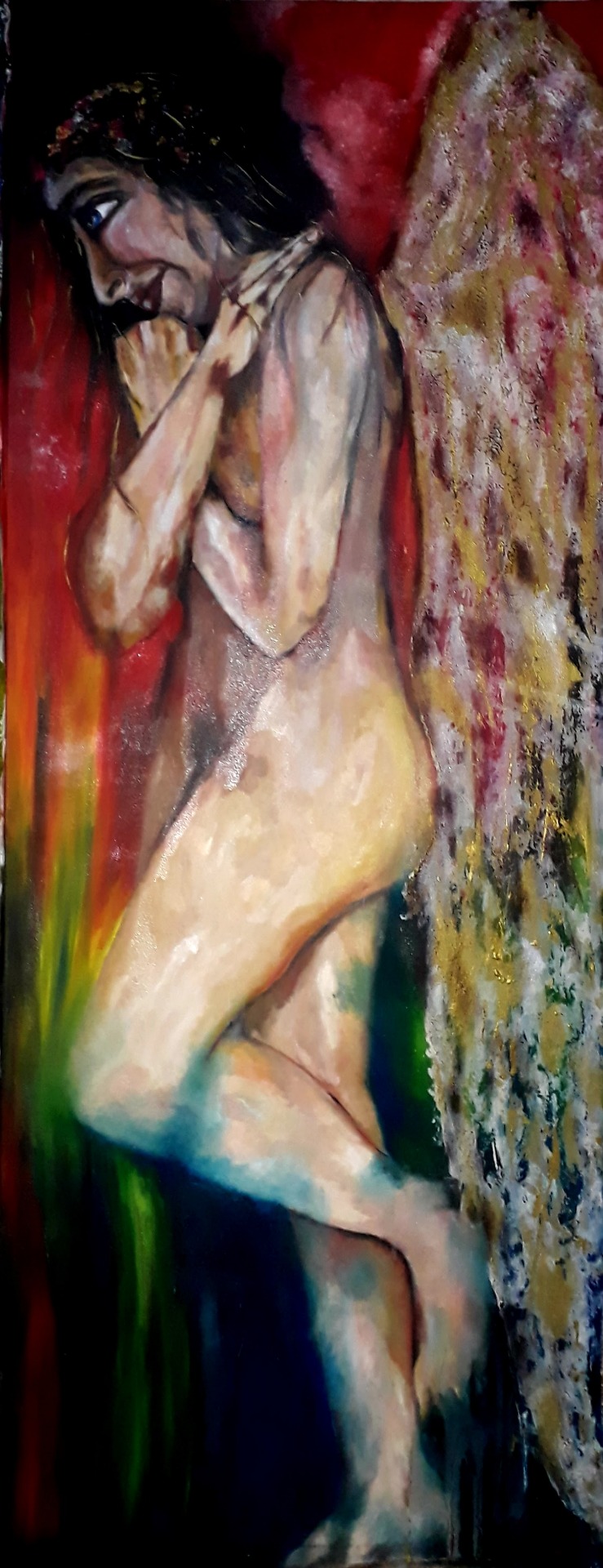Figura y fondo se fusionan, abstracción y figuración, donde predominan los cuerpos en escorzos, el cielo y el agua, logrando así expresar la pasión que siento al pintar, en esta oportunidad con óleo sobre lienzo. Predomina el género expresionista, surrealista, la abstracción y el dripping.